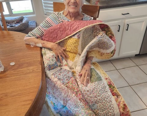 Who receives these quilts that are both beautiful and made with love? Anyone that needs one and asks Community Service Chair Kris Lovetro for one. She considers the circumstances, and sends them out, drops them off, fedEx’s them – it goes to very sick people, anyone from our cousins, to aunts, to brothers and sisters, mothers and fathers… and sometimes to entire families. (We had a family in Strawberry lose their house and each member got a comfort quilt). The name alone, COMFORT quilt – describes it perfectly. As a personal recipient of a comfort quilt, I could feel all the hands that touched it to create such a beautiful quilt.